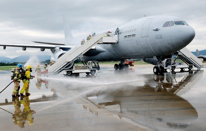 18일 김해국제공항에서 공군 제5공중기동비행단과 한국공항공사 김해공항이 민관군 합동 항공기 사고 대응 훈련을 펼치고 있다. 이날 훈련은 정상회의 행사 주 공항인 김해국제공항에서 APEC 참가국 항공기가 기체 결함으로 동체 착륙해 화재가 발생한 것을 가정해 열렸다. 2025.9.18(사진=연합뉴스)