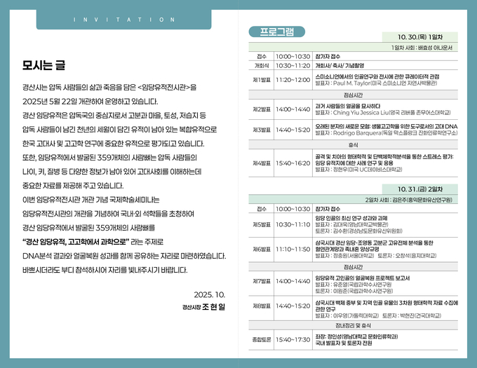 2일차인 31일에는 국내 발표자들의 발표가 이어지는데 영남대학교 박물관 김대욱 박사의 ‘임당 인골의 최신 연구 성과와 과제’에 대한 발표를 시작으로 서울대학교 정충원 교수의 ‘임당 인골의 고유 전체 분석을 통한 혈연 관계망과 족내혼 양상 규명’, 국립과학수사연구원 유준열 연구원의 ‘얼굴 복원 프로젝트 보고서’, 가톨릭대학교 이우영 교수의 ‘삼국시대 백제 인골에 관한 연구’에 대한 발표가 이어진다.