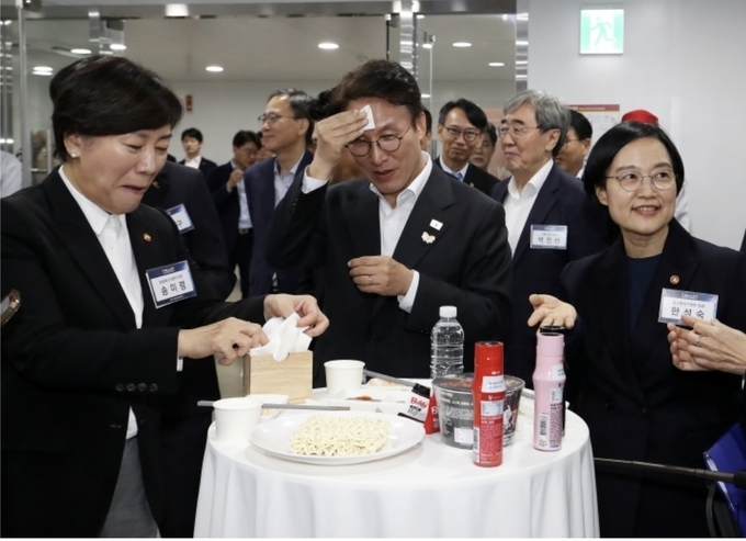 김민석 국무총리가 24일 오후 경남 밀양 부북면 삼양식품 밀양공장을 방문해 불닭볶음면을 시식한 후 땀을 닦고 있다. 2025.10.24. (ⓒ뉴스1)