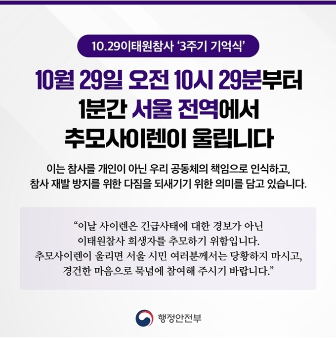 서울시는 행정안전부의 요청에 따라, 29일(수) 광화문광장에서 열리는 ‘이태원참사 3주기 기억식’ 시작에 맞춰 10시 29분부터 1분간 추모사이렌을 울린다고 밝혔다.