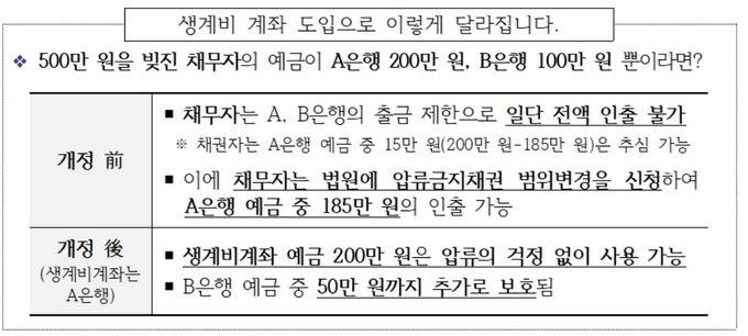 이에 모든 금융기관을 통틀어 1개의 생계비 계좌를 개설할 수 있도록 하고 생계비계좌의 예금은 압류하지 못하도록 민사집행법을 개정했다.
