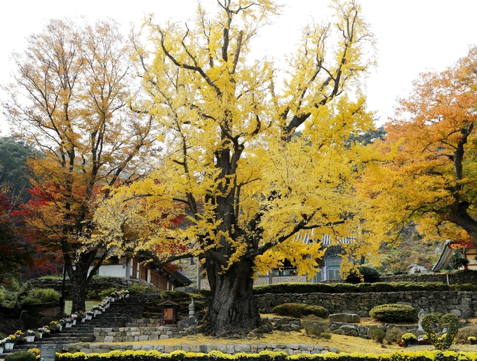 태안군 흥주사 만세루 앞에는 900살의 수령에도 불구하고 여전히 아름다운 색감과 뛰어난 생육 상태를 자랑하는 은행나무가 있다.