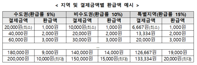이번 환급행사는 지역별로 환급률과 환급한도에 차등을 두어 운영한다. 환급률은 수도권 5%, 비수도권 10%, 특별재난지역과 농어촌 인구감소지역 101곳은 15%이다. 환급한도는 수도권 1만원, 비수도권 1만 5000원, 특별지역은 2만 원이다.