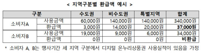 예시로 소비자 A가 수도권에서 6만 원, 비수도권에서 14만 원, 특별지역에서 14만 원을 각각 결제한 경우, 총 결제금액은 34만 원이며 환급금은 3만 7000원이 된다.