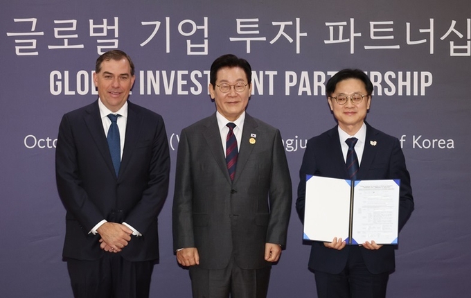 이재명 대통령이 29일 경북 경주예술의전당에서 열린 투자협약식에서 맷 가먼 아마존웹서비스(AWS) CEO, 김정관 산업부 장관과 기념촬영하고 있다. 2025.10.29(사진=연합뉴스)