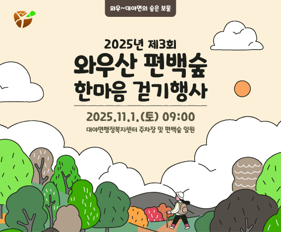[군산/김주창기자] 군산시 대야면이 11월 1일, 대야면 행정복지센터와 와우산 편백숲 일원에서「2025년 제3회 와우산 편백숲 한마음 걷기 행사」를 개최한다.