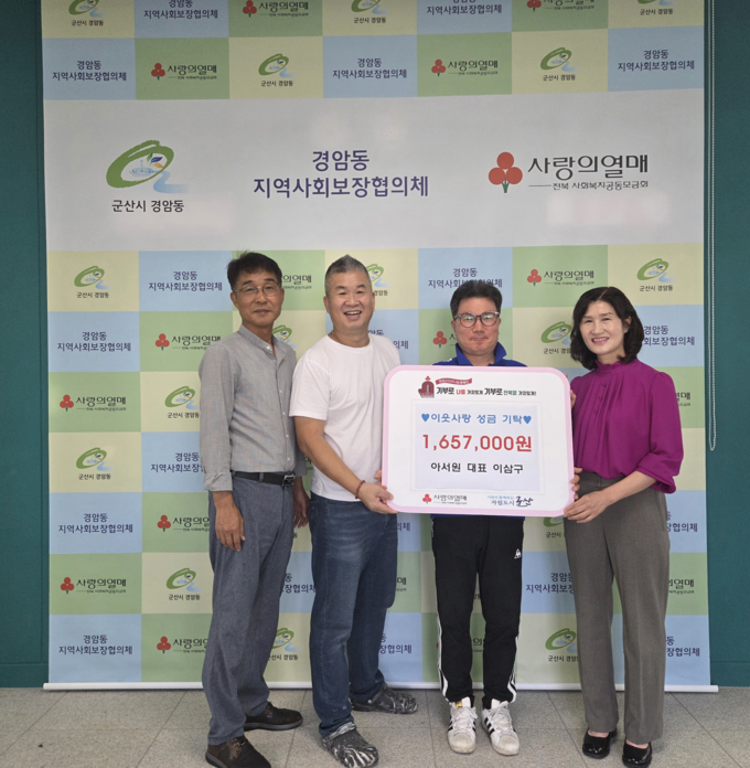 조혜란 경암동장은 “매년 잊지 않고 이웃 사랑을 실천해주시는 이삼구 대표님께 진심으로 감사드린다.”라며, “기탁받은 성금은 지역 내 어려운 이웃들에게 소중하게 전달할 수 있도록 하겠다.”라고 전했다.