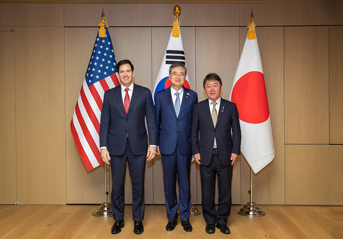 외교부에 따르면 조현 장관은 이날 경주에서 마코 루비오 미국 국무장관, 모테기 도시미쓰 신임 일본 외무대신과 한미일 외교장관회의를 열어 한반도 및 지역 현안과 한미일 3국 간 경제협력 증진 방안 등에 대해 논의했다고 전했다.