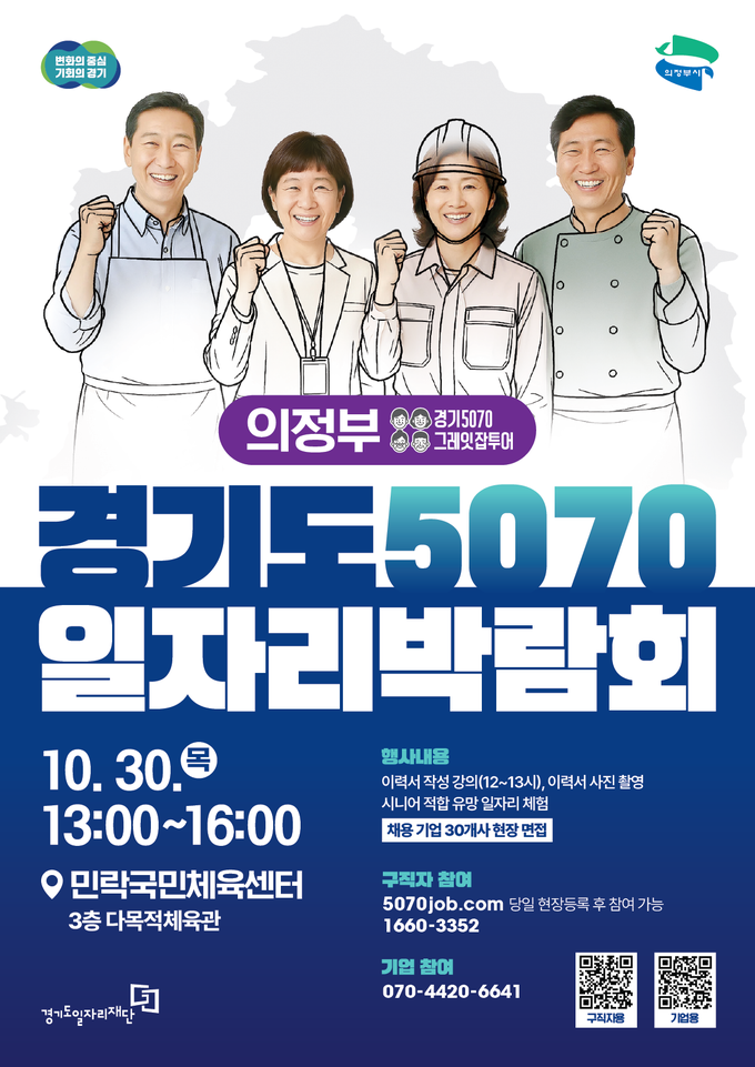 [경기/김명성기자] 경기도일자리재단은 10월 30일 의정부 민락국민체육센터에서 50~70세 중장년층을 위한 ‘2025 경기도 5070 일자리박람회 in 의정부’를 개최했다. 이번 행사는 의정부일자리센터, 의정부시니어클럽 등 지역 유관기관과 협력해 중장년층 구직자에게 맞춤형 취업 기회를 제공하기 위해 마련됐다.