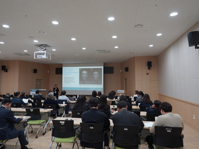 1일차 발표는 영국 리버풀 존 무어스대학교 제시카 리우(Jessica Liu) 박사의 “과거 사람들의 얼굴을 묘사하다” 발표를 시작으로 독일 막스플랑크 진화인류학연구소 로드리고 바르케라(Rodrigo Barquera) 박사의 “오래된 분자의 새로운 모험 : 생물고고학을 위한 도구로서의 고대 DNA” 발표가 이어졌고, 미국 스미소니언 국립자연사박물관 폴 테일러(Paul M. Taylor) 박사의 “스미소니언에서의 인골연구와 전시에 관한 큐레이터적 관점” 발표, 미국 UC데이비스대학교 정현우 교수의 “골격 및 치아의 형태학적 및 단백체학적 분석을 통한 스트레스 평가 : 임당 유적지에 대한 사례연구 및 응용” 발표가 있었다.