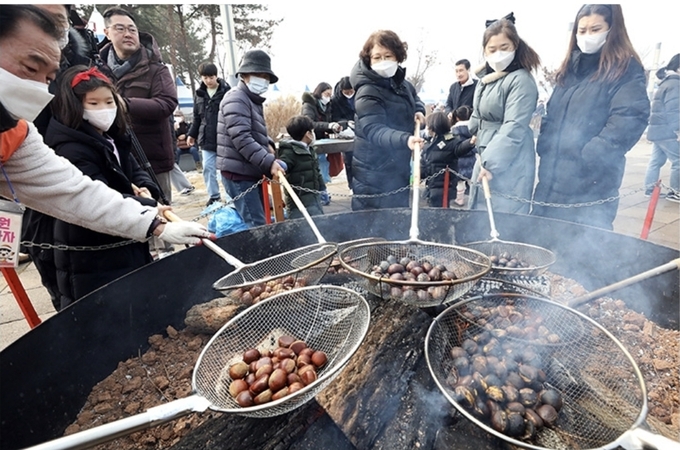 '공주 알밤특구' 아트고마센터에서 열린 '겨울공주 군밤축제'를 찾은 남녀노소 시민들이 대형화로에 알밤뜰망을 이용해 군밤을 직접 구으며 즐거운 시간을 보내고 있다. 2023.1.6 (ⓒ뉴스1)