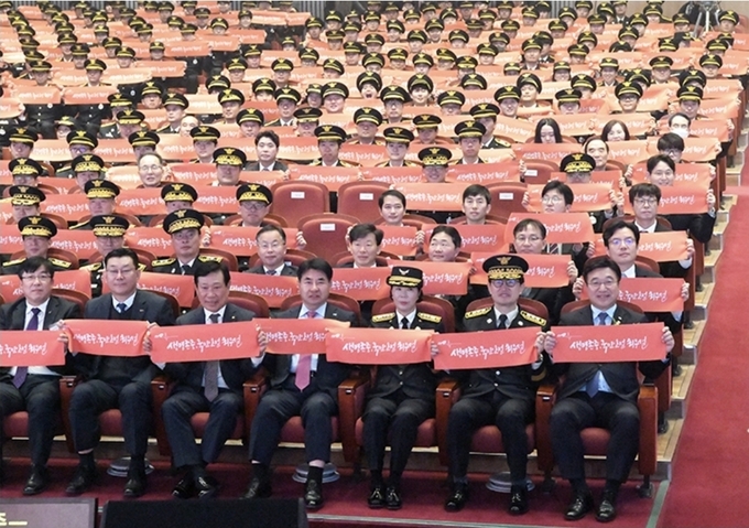6일 '제63주년 소방의날' 기념식을 마치고 참석자들이 슬로건피켓을 들고 단체촬영을 하고 있다.(사진=소방청 제공)
