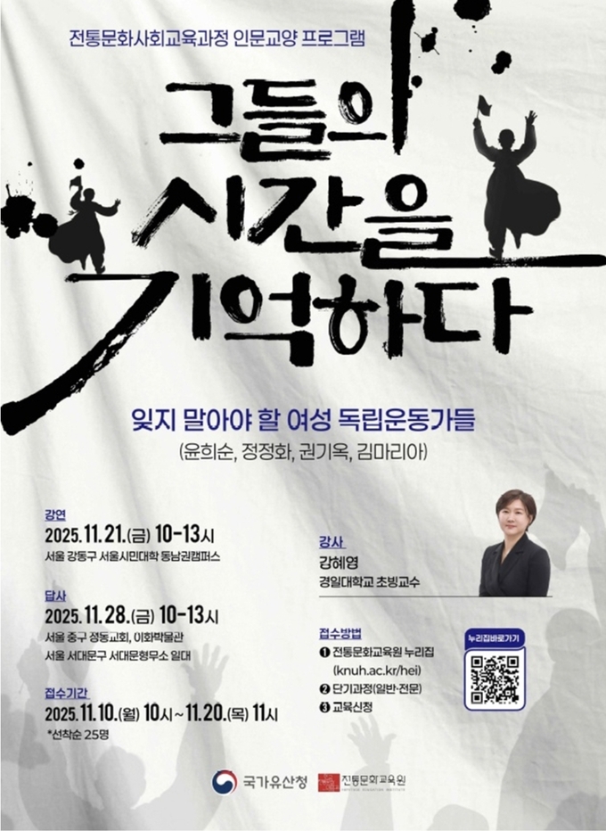이에 한국전통문화대학교 전통문화교육원은 오는 21일과 28일, 매주 금요일 2회에 걸쳐 2025년도 인문교양프로그램 '그들의 시간을 기억하다 - 잊지 말아야 할 여성 독립운동가들'을 운영한다.