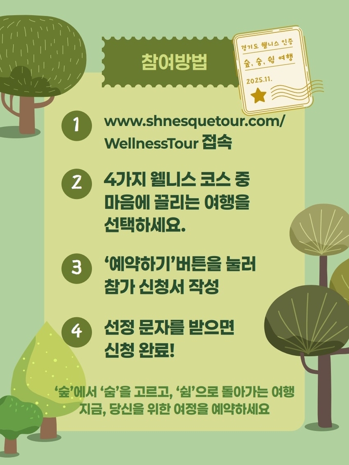 [경기/김명성기자] 경기도가 오는 12일부터 30일까지 ‘경기북부 웰니스 시범투어’를 운영한다. 이번 프로그램은 경기북부 지역의 인증 웰니스 관광지를 연계해 도민에게 회복과 재충전의 기회를 제공하고, 경기형 웰니스 관광 콘텐츠를 개발하기 위해 기획됐다.