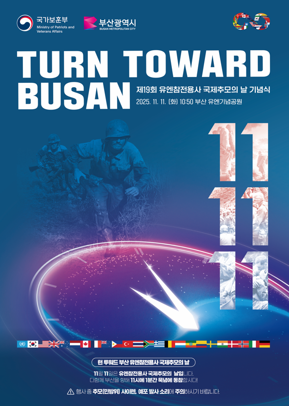 [부산/문종덕기자] 부산시(시장 박형준)는 내일(11일) 오전 10시 50분 유엔기념공원에서 부산 유엔기념공원을 향한 전 세계의 동시 묵념과 추모 행사인 「턴 투워드 부산(Turn Toward Busan), 제19회 유엔참전용사 국제추모의 날 기념식」이 거행된다고 밝혔다.
