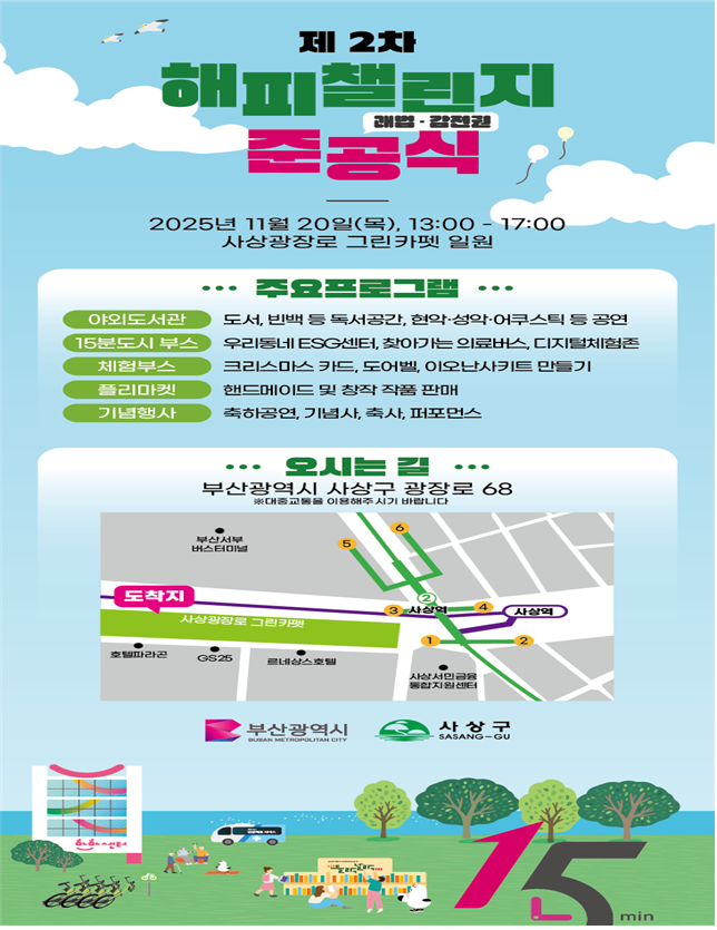 박형준 시장은 “오늘 준공한 해피챌린지 사업은 단절된 도심을 '연결'로 바꾸는 첫걸음이자, 사상구 녹지를 잇는 중요한 연결축”이라며, “앞으로도 시민이 문화와 여가를 누리고 마음을 나누는 다양한 15분도시 기반(인프라)을 마련해, 부산 전체의 삶의 질과 생활 품격을 높여나가겠다”라고 전할 예정이다.