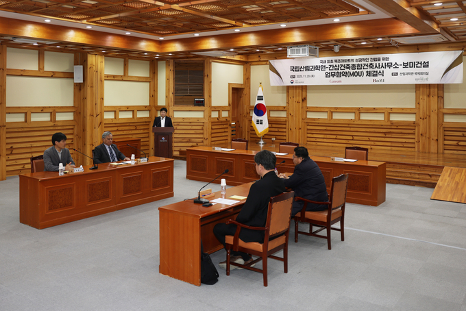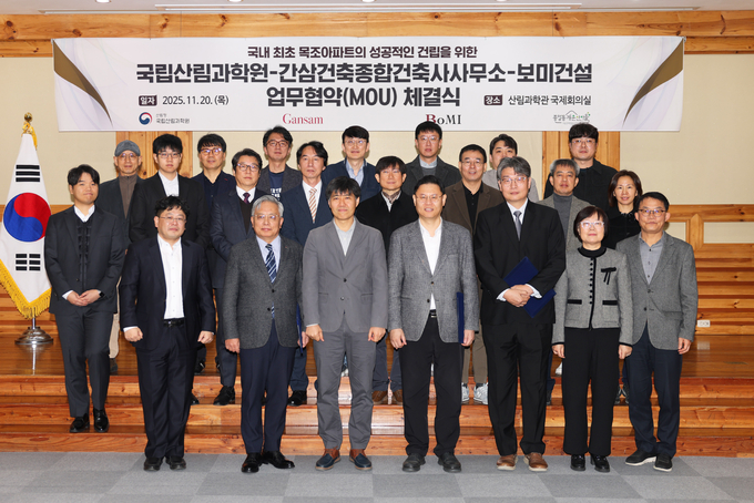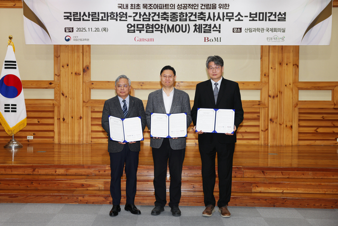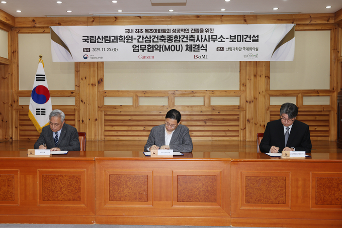 [한국방송/최동민기자] 산림청 국립산림과학원(원장 김용관)은 20일(목), 간삼건축종합건축사사무소, 보미건설과 함께 국내 최초 목조아파트 건립을 위한 업무협약을 체결했다고 밝혔다.