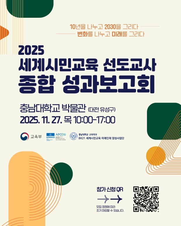 [한국방송/오창환기자] 교육부(장관 최교진)는 유네스코아시아태평양국제이해교육원(원장 임현묵)과 함께 11월 27일(목) 충남대학교 박물관에서 2025년 세계시민교육 선도교사 종합 성과보고회를 개최한다.