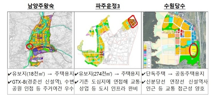 조정대상 입지들은 3기 신도시 남양주왕숙(455호), 2기 신도시 파주운정3(3200호), 중소택지 수원당수(490호) 등 주요 지구별로 고르게 구성되어 있고, GTX-B, 신분당선 등 광역교통망과 인접해 접근성이 우수하고 주거 입지 적정성이 높은 입지들이라는 점도 특징이다.