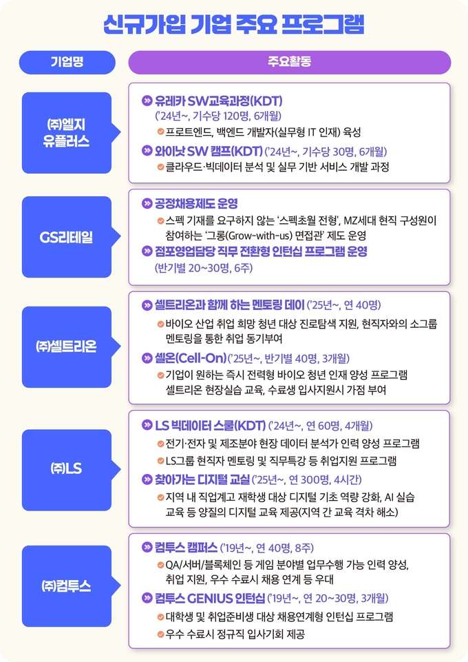 이날 행사에서는 신규가입 기업 엘지유플러스와 우수 활동기업 카카오의 사례 발표가 있었다. 엘지유플러스는 실무형 정보기술(IT) 인재 양성 프로그램인 ‘유레카 소프트웨어 교육과정’ 등을 통해 청년의 취업을 지원하고 있다. 카카오는 현직 경험을 보유한 강사진과 함께 팀 프로젝트 기회 등을 제공하여 청년이 개발자로 성장하도록 지원하는 ‘카카오테크 캠퍼스’를 운영하고 있다.