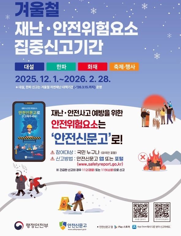 이번 기간에는 겨울철에 발생 가능성이 높은 ▲대설 ▲ 한파 ▲화재 ▲축제·행사 등 4가지 유형의 위험 요소를 대상으로 시민이 직접 신고할 수 있다.