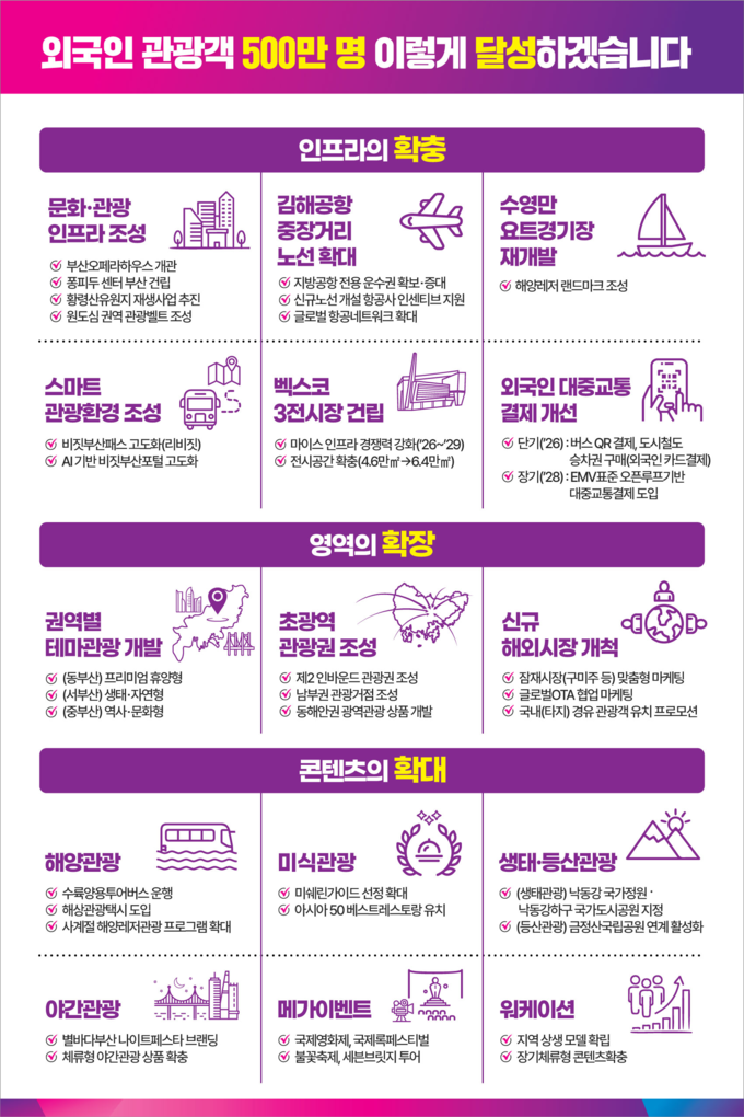 시는 '2028 외국인 관광객 500만 시대, 글로벌 관광도시 부산 도약'을 비전으로, 이를 위한 5대 전략·15대 중점 과제를 추진한다.