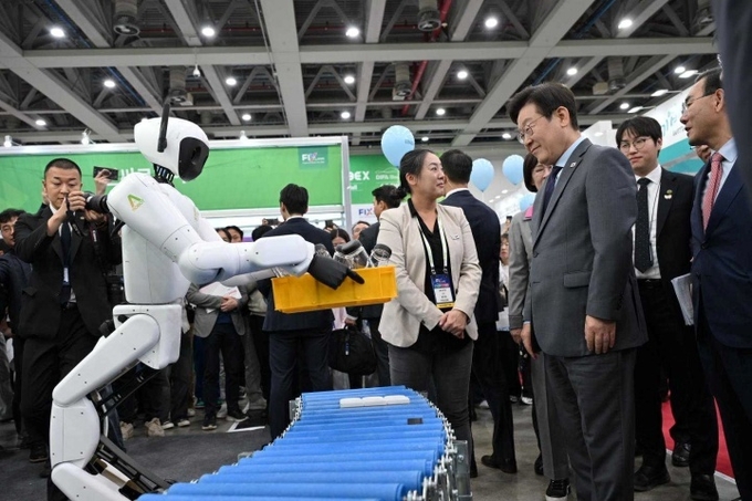 10월 24일 대구에서 열린 '2025 미래혁신기술박람회(FIX 2025)'에 참가한 휴머노이드 로봇 제조기업 '에이로봇' 부스에 이재명 대통령이 방문해 로봇들의 시연을 지켜보고 있다. 이재명 대통령 왼쪽이 에이로봇 엄윤설 대표. (에이로봇 제공)