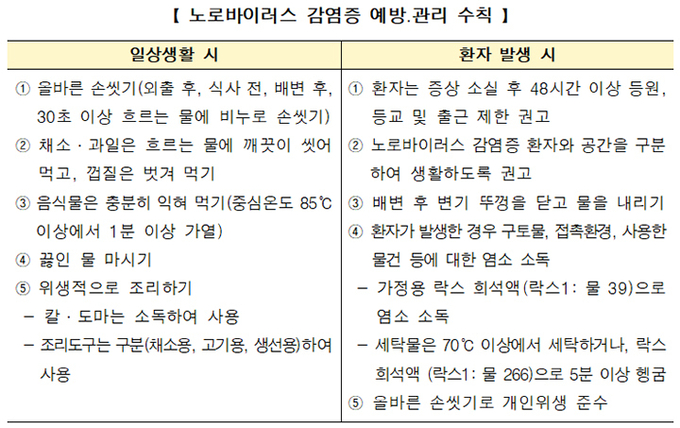 임승관 질병관리청장은 "노로바이러스감염증 예방을 위해 올바른 손씻기 등 예방수칙 준수와 안전하게 조리한 음식 섭취가 필요하다"며 "특히 영유아 보육시설에서는 유증상자 등원 자제와 환자 사용 공간 소독이 필수적이며, 집단 환자가 발생할 경우 가까운 보건소로 신고해 주시기 바란다"고 당부했다.
