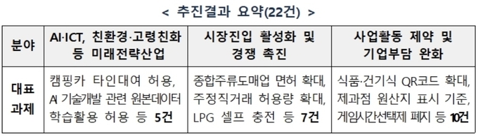 올해는 특히 AI·ICT, 친환경·고령친화 등 미래전략산업 중심의 규제환경 조성, 시장진입 활성화, 기업부담 완화에 중점을 두고 총 22건의 개선방안을 마련했다.