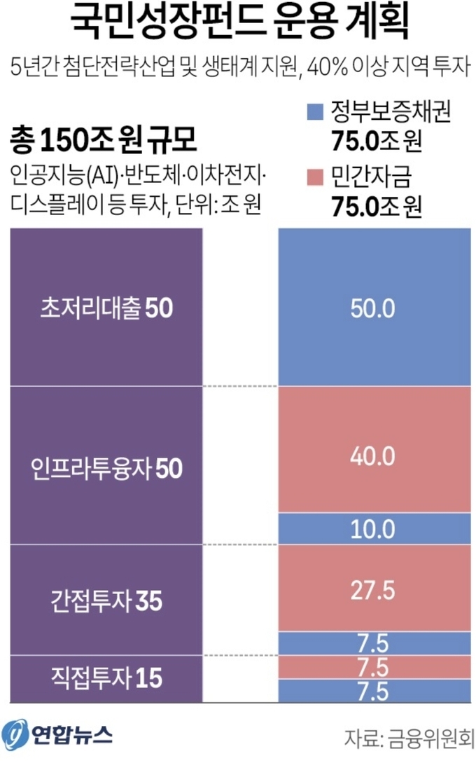 국민성장펀드는 앞으로 5년 동안 정부보증채권 75조 원과 민간자금 75조 원 등 150조 원 규모로 구성되며, 직접투자 15조 원, 간접투자 35조 원, 인프라 투융자 50조 원, 초저리대출 50조 원으로 나뉜다.