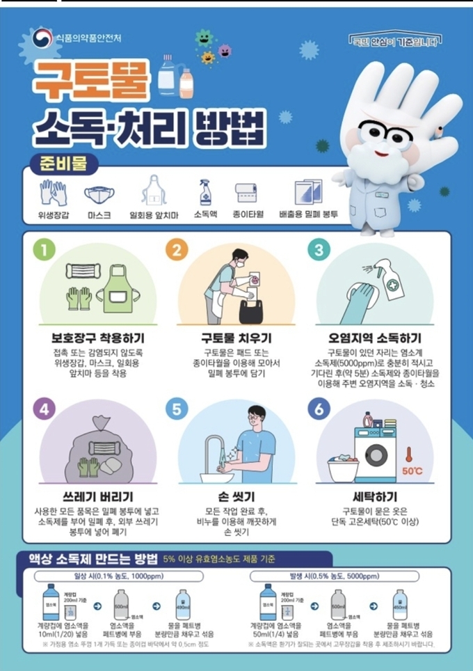 참고로 올해 식약처는 구토에 의한 식중독 확산을 방지하기 위해 어린이집 등 전국 영유아 시설에 ‘구토물 소독 처리키트(위생장갑, 마스크, 소독액, 타월 등)’ 36,000개를 배포하였다.