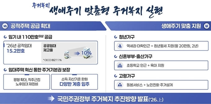 무주택 서민 등을 위해 합리적 가격으로 장기간 거주 가능한 공적주택은 5년간 최소 110만호 공급하고, 주거비 부담이 적은 공적 임대주택은 최소 15만 2000호를 공급한다.