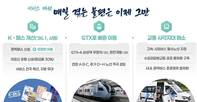 GTX 등도 신속히 확충해 국민들의 출퇴근 불편을 덜어내고, 수요응답형 교통(DRT) 활성화를 위한 공공 플랫폼도 빠르게 구축할 방침이다.