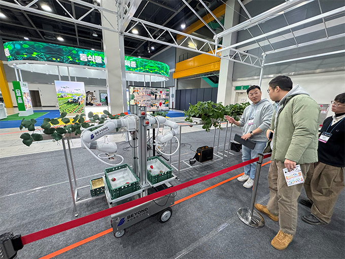 비욘드로보틱스는 AI와 하드웨어를 결합한 '피지컬 AI' 기반 수확 로봇을 개발하고 있다. 부스에서는 실제 딸기 수확을 시연하며, 이들의 기술이 농업 현장에서 겪는 농업인구 고령화와 인력 부족의 문제를 해결할 수 있다는 점을 강조했다.