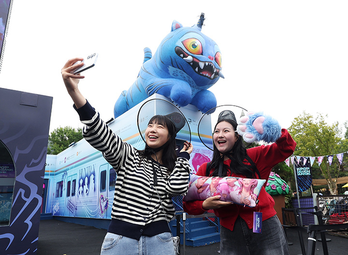 지난 9월 30일 경기도 용인시 에버랜드에 마련된 '케이팝 데몬 헌터스' 테마존에서 관람객들이 사진을 찍고 있다.(사진=연합뉴스)