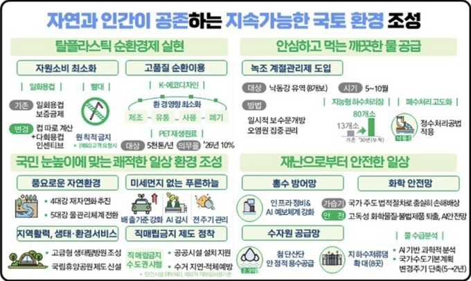 국민이 쾌적한 일상환경을 누릴 수 있도록 자연환경(생태하천), 미세먼지, 생태·환경서비스, 생활폐기물 등 부문별 대책을 추진한다.