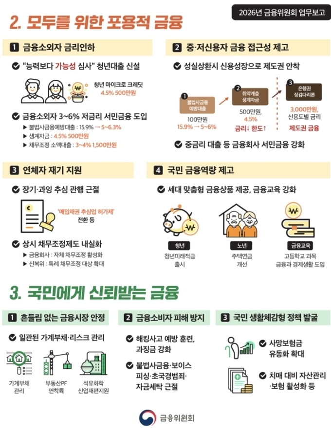 금융위는 올해 장기연체 채권 소각·신용사면 등 긴급 지원에 이어, 금융소외자의 고금리 부담과 장기·과잉 추심 등 구조적 문제를 해결해 포용적 금융을 구현한다.