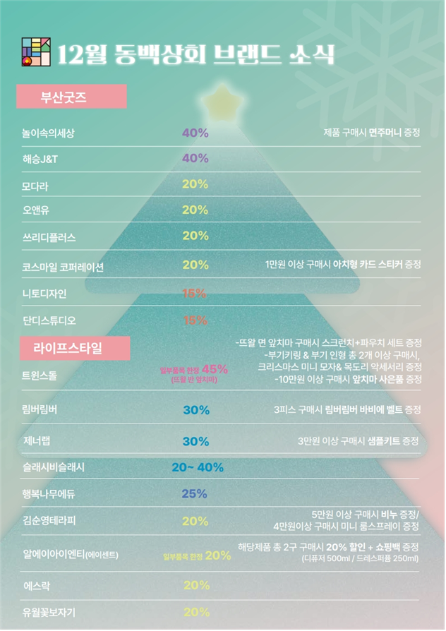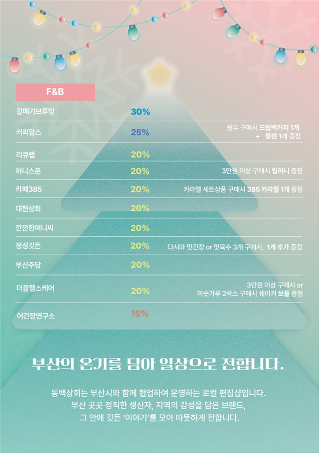 [부산/문종덕기자] 부산시(시장 박형준)와 부산경제진흥원(원장 송복철)은 부산 우수 제품 쇼핑 숍 「동백상회」에서 12월 31일까지 송년 감사 특별 할인 행사를 개최한다고 밝혔다.