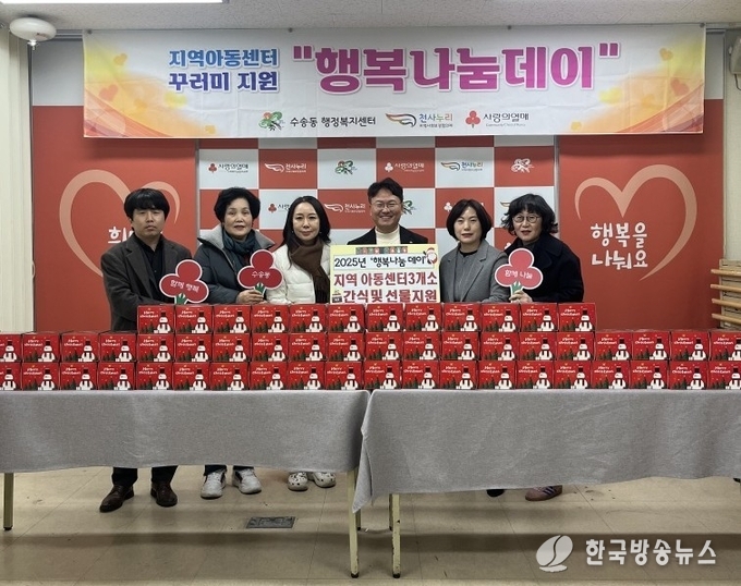 ‘행복나눔데이’는 수송동 천사누리지역사회보장협의체가 사회복지공동모금회의 지원을 받아 진행하고 있으며, 수송동 관내 지역아동센터 3개소(예품, 행복한, 한아람)를 이용하는 아동들을 위해 간식과 선물꾸러미를 전달하는 사업이다.
