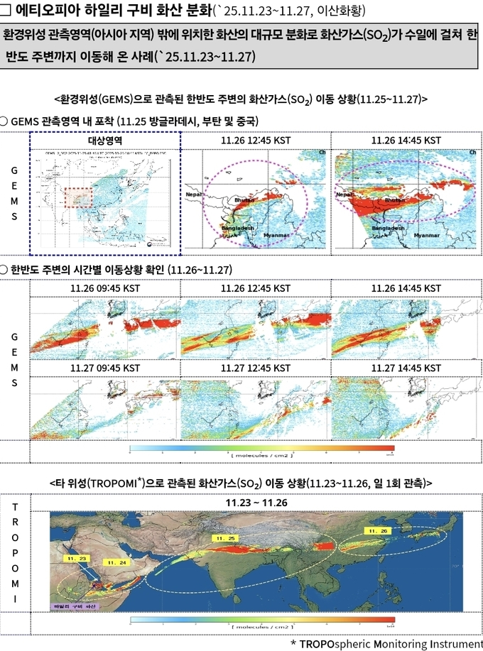 또한 국외의 화산분화* 활동 중, 올해 11월 말 에티오피아 하일리 구비 화산 폭발 등을 대표 사례로 선정해 방출된 다량의 화산가스(이산화황)가 인도와 중국을 지나 정지궤도 환경위성 관측 영역인 아시아 일본까지의 장거리 이동한 특성과 시간변화를 포착하여 함께 수록했다.