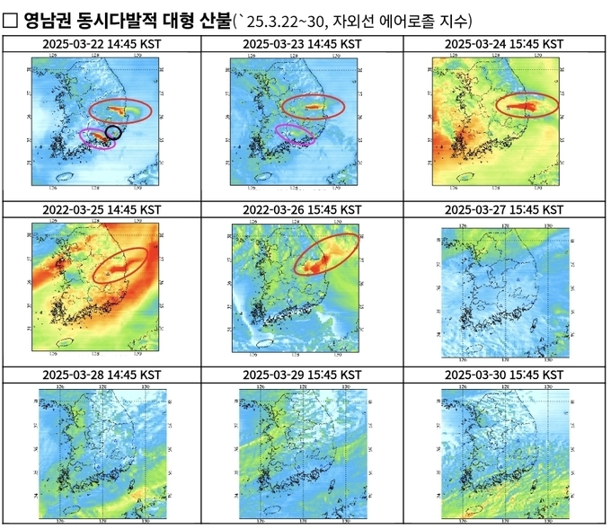 이번 보고서는 정지궤도 환경위성을 통해 올해 국내 및 국외에서 동시다발적으로 발생한 대형 산불* 중 에어로졸 정보와 휘발성 유기화합물** 등 대기오염물질의 분포와 확산 상황을 시간대별로 담았다.