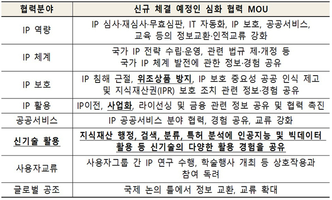 이에 ▲위조상품 방지 등 지식재산 보호 협력 ▲심사 및 특허분석에 인공지능·빅데이터 등 신기술 활용 ▲지식재산 거래·사업화·금융 활성화 등 협력 범위를 대폭 확대한 것이다.
