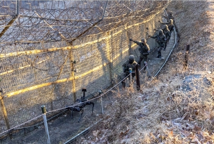 5사단 열쇠부대 군 장병들이 경기 연천군 접경지역에서 시범 운용 중인 다족 보행 로봇과 함께 철책 경계 근무를 하고 있다. 2025.12.29 (사진=연합뉴스)