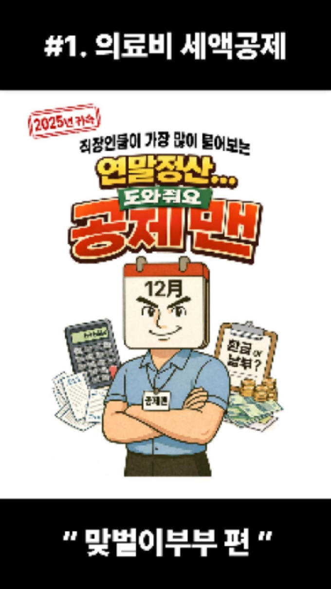 국세청(청장 임광현)은 2025년 귀속 연말정산 시기를 맞아, 인공지능(AI) 기술을 활용해 연말정산 상담사례를 친숙한 캐릭터로 풀어낸 ‘연말정산 도와줘요 공제맨’ 콘텐츠(4컷만화・숏츠영상)를 제공합니다.