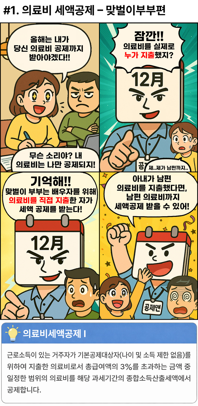 #1. 의료비세액공제 - 맞벌이부부편 #2. 의료비세액공제 - 자녀편 #3. 부모님인적공제 #4. 육아휴직 배우자 인적공제 #5. 출산보육수당 비과세 #6. 출산보육수당 비과세 - 맞벌이 #7. 월세세액공제 - 대학생자녀 #8. 월세세액공제 - 현금영수증공제 중복불가 #9. 교육비세액공제 - 미취학아동 학원비 #10. 교육비세액공제 - 맞벌이부부 자녀편 #11. 기부금세액공제 - 기본공제대상자 지출액 #12. 기부금세액공제 - 취업 전 지출액 |