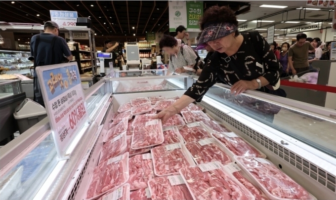 서울 이마트 용산점에서 고객들이 삼겹살을 구매하고 있다. 2025.7.29. (ⓒ뉴스1)