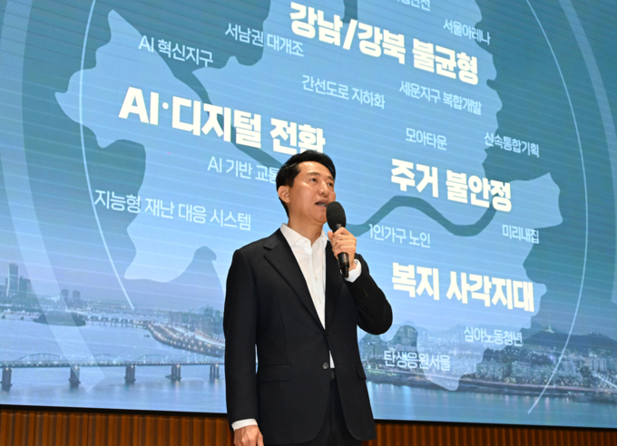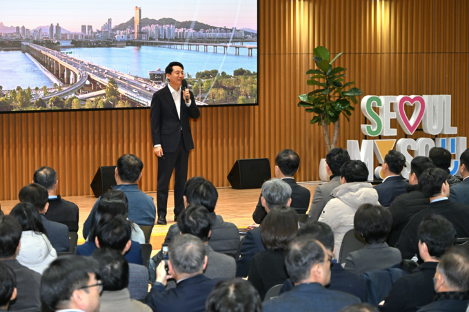 오세훈 서울시장이 12일(월) 오전 '2026년 신년 직원조례'에서 서울시 창의행정이 나아가야 할 방향에 대해 이야기하고 있다.
