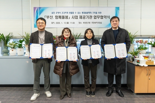 부산 부산진구(구청장 김영욱)는 지난 12일 ▲부산진시니어클럽 ▲부산진지역자활센터 ▲한국치매돌봄협동조합과 '부산, 함께돌봄' 사업의 상호협력체계 구축을 위한 업무협약을 체결했다.
