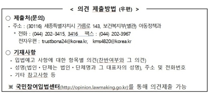 복지부는 입법예고 동안 의견을 폭넓게 수렴한 뒤 개정안을 확정하고, 관련 의견은 다음 달 25일까지 복지부 아동정책과 또는 국민참여입법센터로 제출하면 된다.
