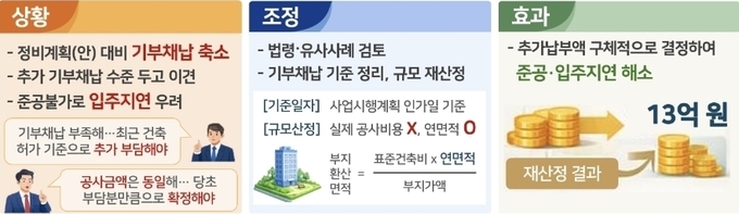 지원센터는 관련 법령과 유사사례를 토대로, 기부채납은 면적을 기준으로 하며 규모‧가액 등의 산정시점은 사업시행계획 인가일을 기준으로 함이 타당하다 해석하면서, 해당 현장이 완화받은 용적률 대비 부족한 기부채납분을 직접 산정(약 13억 원)해 인‧허가 기관과 사업자 간 불필요한 분쟁 및 사업지연을 방지하고 예정대로 준공이 가능하게 도왔다.